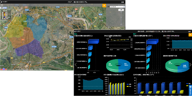 實時集中監(jiān)控平臺以簡潔、美觀的圖表頁面,集中展現(xiàn)企業(yè)各環(huán)節(jié)經(jīng)營數(shù)據(jù)。武漢移動經(jīng)過多年信息化的建設,已形成區(qū)域化的業(yè)務管理體系,并積累了大量的業(yè)務數(shù)據(jù)。為清晰呈現(xiàn)各項指標在全市范圍內(nèi)不同區(qū)域的整體情況,億信BI通過在GIS地圖上對各區(qū)域模塊進行顏色渲染,清晰展示企業(yè)業(yè)務區(qū)域的分布情況(如下圖左側(cè)所示),同時通過多TAB頁的展示方式(如下圖右側(cè)所示),以專題化(包括收入,用戶發(fā)展、4G發(fā)展等專題)的頁面,分析了各主題中不同項經(jīng)營指標的排名,占比,趨勢以及對比情況,從而使決策者可快速定位自己所關心的重點數(shù)據(jù)。