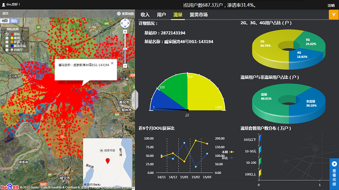 基于GIS地圖的沙盤式管理理念,依托于百度地圖的地理信息,結合武漢移動已有的業(yè)務數(shù)據(jù),億信BI實現(xiàn)了對武漢移動各區(qū)域市場、企業(yè)客戶、渠道網(wǎng)點的集中管理和實時監(jiān)控,真正實現(xiàn)了企業(yè)的沙盤式管理思想。