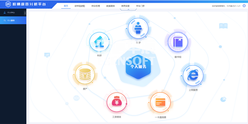 個人服務以多維度來分析和展現個人的各項工作和生活數據,包括教學、圖書館、上網服務、一卡通消費、工資績效、資產和科研等模塊,通過下鉆可以查看對應模塊的詳細情況。如下圖: