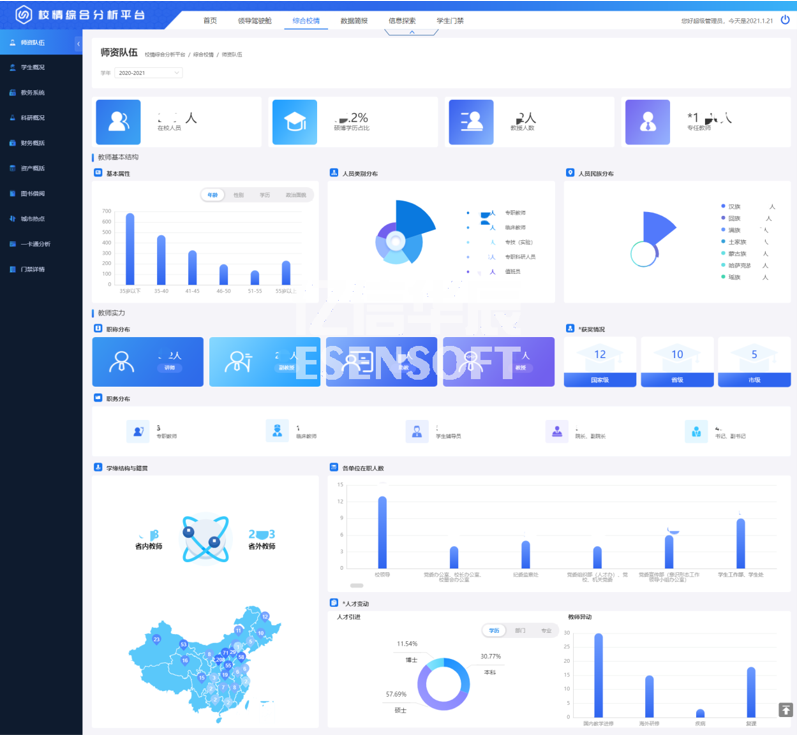 高校師資隊伍建設的優劣決定了高校人才培養質量的高低。如何在大數據時代科學利用源于高校各個層面的海量數據,并使之成為高校師資隊伍建設的參考與方向,是眾多高校需要解決的問題。師資隊伍頁面通過展現教職工主要的屬性指標,分析了目前高校師資隊伍建設中所存在的問題,對加強高校師資隊伍建設起到指導作用。如下圖: