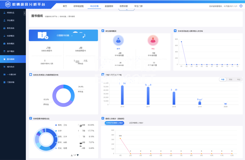 學生概括展現出學生的基本屬性、人數分布、學籍情況、借閱與消費、畢業與就業等指標。如下圖:
