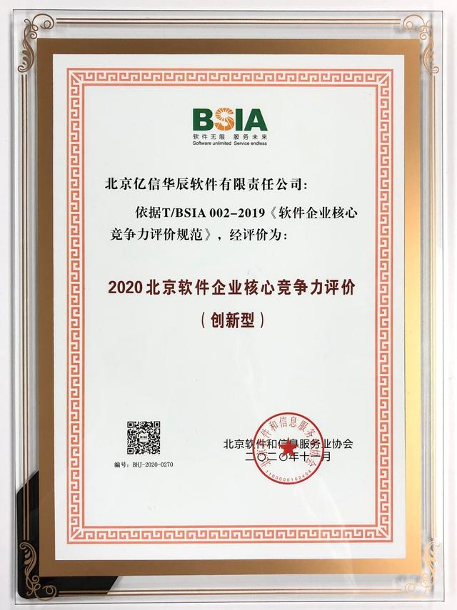 今年,北京軟協(xié)聚焦北京市軟件和信息服務(wù)業(yè)內(nèi)的優(yōu)秀企業(yè),依據(jù)《軟件企業(yè)核心競爭力評價(jià)規(guī)范》(T/BSIA 002-2019),從企業(yè)規(guī)模、經(jīng)營業(yè)績、研發(fā)能力、創(chuàng)新成果、質(zhì)量保證五個(gè)維度進(jìn)行層層審核,優(yōu)中選優(yōu)。最終,億信華辰憑借自身在信息化領(lǐng)域的創(chuàng)新能力脫穎而出,獲得了"創(chuàng)新型"評價(jià)。