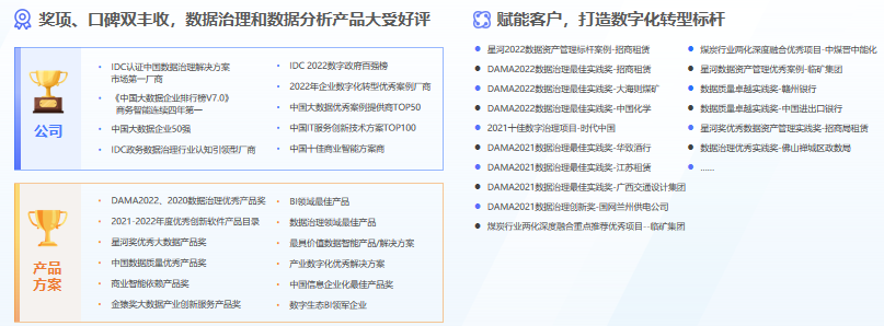 作為大數(shù)據(jù)行業(yè)的領(lǐng)軍企業(yè),億信華辰敏銳把握市場(chǎng)需求,精益求精不斷進(jìn)步,不斷打磨兩大核心產(chǎn)品——億信ABI與睿治數(shù)據(jù)治理平臺(tái)。憑借創(chuàng)新、易用、強(qiáng)大的特性,產(chǎn)品自發(fā)布以來持續(xù)領(lǐng)先于同時(shí)代其他產(chǎn)品,受到客戶廣泛認(rèn)可,打造出多個(gè)數(shù)字化轉(zhuǎn)型標(biāo)桿,并拿下眾多殊榮:多次入選Gartner《中國(guó)分析平臺(tái)市場(chǎng)指南》代表廠商,三度斬獲DAMA數(shù)據(jù)治理優(yōu)秀產(chǎn)品獎(jiǎng),蟬聯(lián)IDC中國(guó)數(shù)據(jù)治理解決方案市場(chǎng)第一……