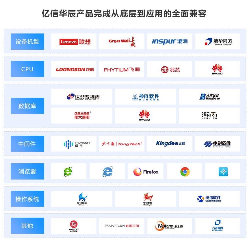 億信華辰旗下產品的開發框架、前后端組件、數據組件等,均采用自主研發完成,整體代碼自研率達98.3%,掌控核心技術,輕松適配我國各類軟硬件平臺;并與與飛騰CPU、華為TaiShan服務器(鯤鵬平臺)、東方通應用服務器、達夢數據庫以及銀河麒麟、統信操作系統等國產CPU、操作系統、整機服務器廠商的兼容適配工作,共同助推國產化進程。
